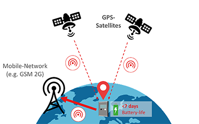 Das Globale Positionsbestimmungssystem (Englisch: Global Positioning System (GPS)), offiziell NAVSTAR GPS (Navigational Satellite Timing and Ranging – Global Positiong System) genannt, ist ein satellitengestütztes System im Besitz der Regierung. GPS besteht immer aus zwei Elementen: Einer speziellen GPS-Antenne, die in ein Gerät eingebaut ist, und einer Reihe von Satelliten, die die Erde umkreisen und Radiowellen aussenden. Die GPS-Antenne im Inneren des Gerätes empfängt Signale von verschiedenen Satelliten in Reichweite und kann dadurch die genaue Position (1-5 m) berechnen. GPS ist ein «Ein-Weg-System» – es ist also nicht möglich, «mit dem Satelliten zu kommunizieren» oder Daten an den Satelliten zurückzusenden. Die meisten Mobiltelefone enthalten einen GPS-Chip zur Bestimmung der Position. GPS-Chips verbrauchen eine ziemlich grosse Menge an Energie. Daher eignen sie sich nicht für kleine Fracht-Tracker, die über mehrere Monate hinweg in Betrieb sind.