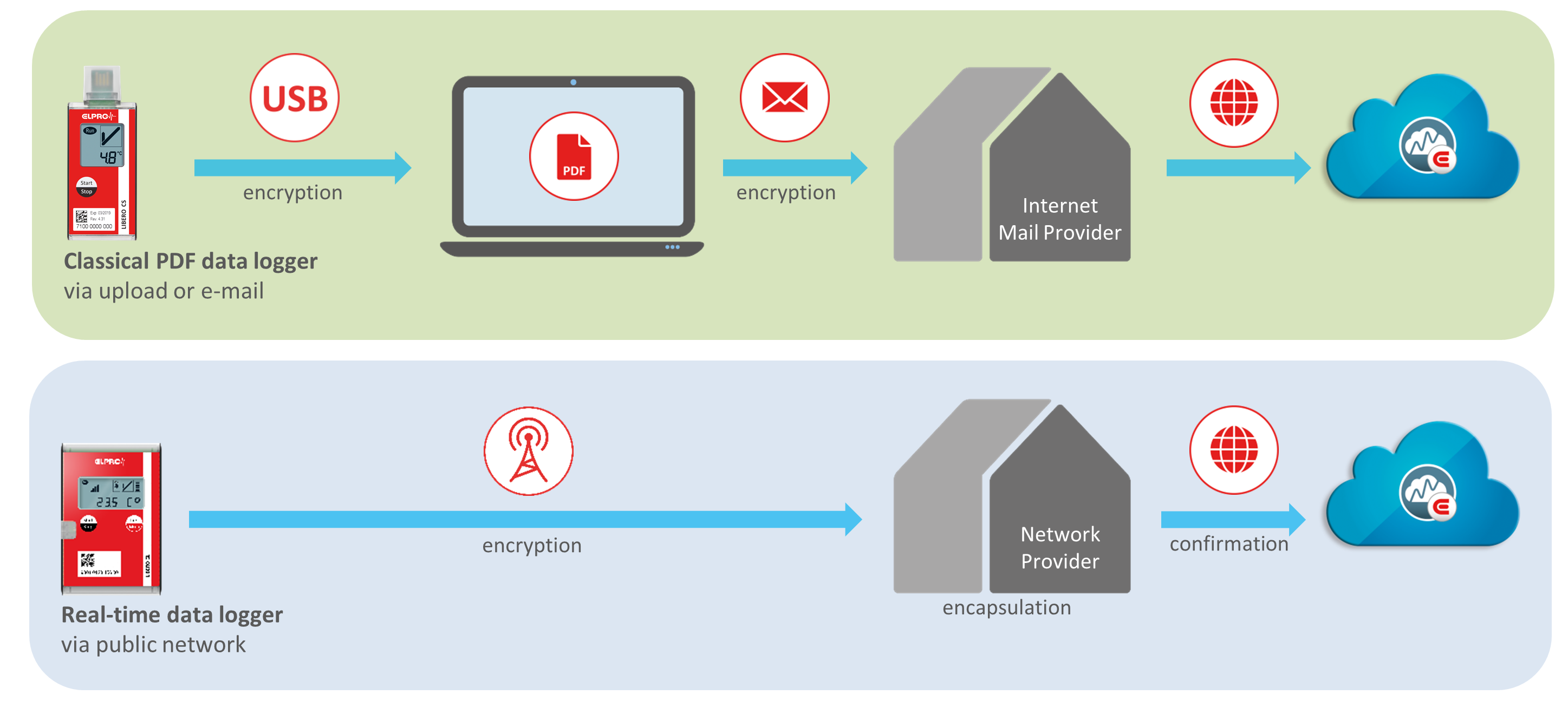 Bei Real-Time-Geräten, die mit einem öffentlichen Netzwerk arbeiten, beginnen die Sicherheitsbemühungen damit, dass die Geräte mit maximalen Sicherheitsstufen (einschliesslich der Verschlüsselung) entworfen werden. Darüber hinaus kann der Netzwerkanbieter den Datenstrom über IPsec-Tunnel (Internet Protocol Security) oder MPLS (Multiprotocol Label Switching) einkapseln. Auf diese Weise wird das öffentliche Netzwerk quasi zu einem privaten Netzwerk und ermöglicht eine sichere Verbindung in einer gemeinsamen Infrastruktur mit schlüssigen Domänen. Die wichtigste Sicherheitsmassnahme ist jedoch die Bestätigung: Erst nach der Bestätigung, dass die Daten mit der richtigen Prüfsumme in der Cloud angekommen sind, «hakt» der Datenlogger das Kommunikationspaket ab – ansonsten schiebt er die Daten wieder in ihrer ursprünglichen Form weiter.