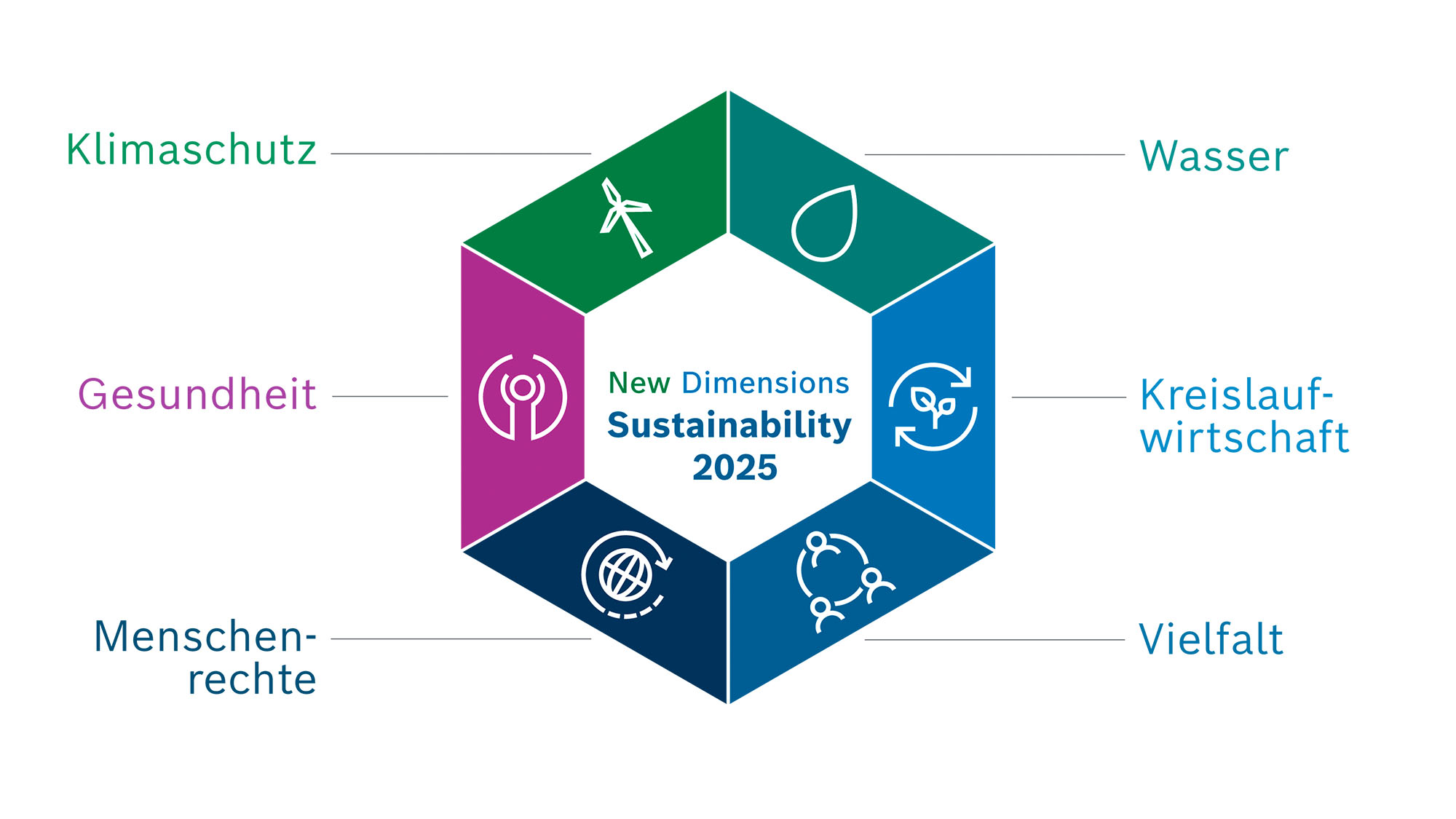 Die Nachhaltigkeitsstrategie von Bosch fusst auf konkreten Zielsetzungen in allen wesentlichen Themenfeldern. Die Schwerpunkte des Nachhaltigkeitsmanagements sind im Zielbild «New Dimensions – Sustainability 2025» zusammengefasst.