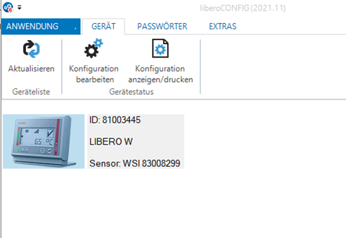 Nach erfolgreicher Verbindung mit dem USB-Anschluss wird der LIBERO W in liberoCONFIG angezeigt. Durch Klick auf «Konfiguration bearbeiten» öffnet sich das Konfigurationsmenü.