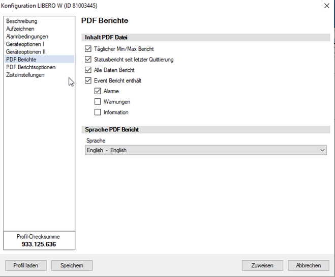 Unter dem Punkt „PDF Berichte“ können Sie auswählen, welchen Umfang und welche Informationen im PDF-Auswertebericht angezeigt werden sollen. Hier können Sie auch die Sprache des PDF-Berichts definieren.