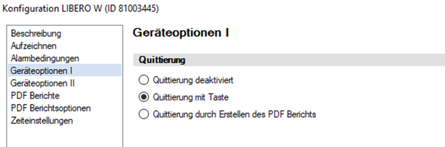 Unter „Geräteoptionen 1 können Sie die gewünschte Alarmquittierungsart definieren.