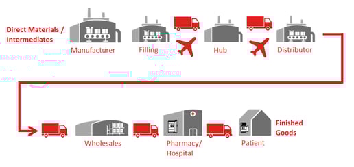 Wie die meisten Lieferketten von industrialisierten Produkten ist auch die pharmazeutische Lieferkette komplex und besteht aus mehreren Schritten. Darüber hinaus sieht die Lieferkette jedes pharmazeutischen Produkts anders aus und hängt von der Produktkomplexität, sowie der Produktionsregion ab. Während teure Produkte wie gentechnisch hergestellte Medikamente typischerweise eine sehr kurze Lieferkette haben, haben preiswerte rezeptfreie Medikamente wie Aspirin eine viel komplexere Lieferkette mit mehreren Schritten zwischen Produktion und Patient. Was alle Pharmalieferketten gemeinsam haben, ist die Unterscheidung zwischen dem Transport von Active Product Ingredients (API) und Fertigprodukten. In letzter Zeit umfasst der Umfang der Temperaturüberwachung von Pharma Produkten zunehmend die letzte Transportmeile zur Apotheke oder gar zum Patienten. Direct-to-Patient-Shipment (DtP) wird immer beliebter und wichtiger, insbesondere bei klinischen Studien, aber auch bei personalisierbaren Medikamenten.