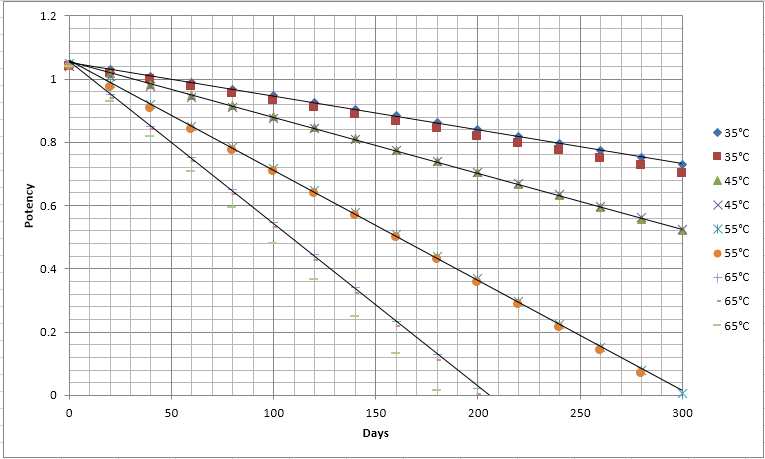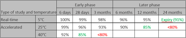 The same substances are still exposed to the same temperatures and tested after different periods to determine if the ingredient is still potent more than 80%. As a result, a new version of the stability budget is issued (in above case 8-25°C for 12 months and still 25-40°C for 28 days). After 24 months, still 91% of the potency is available if stored at 5°C. Based on stress tests and other safety and market considerations, the final expiry date is defined to be 24 months.