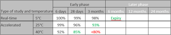 Different lots or batches of the substance are exposed to different temperatures. After different periods (6 days, 28 days, 3 months), a test is performed if >80% of active ingredient is still potent. As a result of this early phase, a first version of the stability budget is issued (in above case 8-25°C for 3 months, 25-40°C for 28 days). Since after 3 months more than 98% of the potent is still there, a first (conservative) version of the expiry date is calculated using the Arrhenius equation and defined to be 6 months.