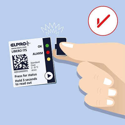 LIBERO ITS has a simple process to operate. After the electronic indicator is applied at point of packaging, it travels safely attached to the unit-level product through as many depots, handlers and modes of transport as the product faces. At any one of those transit or storage points, the indicator displays if the shipment is OK or not (green = OK; red = ALARM).
