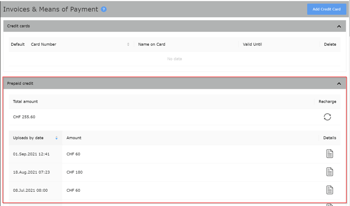 In the Prepaid credit and Payments section, you will now see your credit balance and other payment activities listed in the table.
