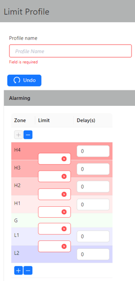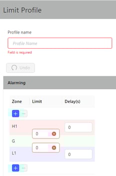 To create a new limit profile, simply select the "Add Limit Profile" button located in the upper right corner. A form will appear, allowing you to define your unique profile by specifying the Profile name, upper limit (H1), lower limit (L1), and the delays for the initial alarm activation (measured in logging intervals).