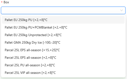Box: Select the type of packaging used. You can find a selection of different types (package/box, pallet,...), sizes (4L, 8L, 25L, 250kg,...) and materials (PU - polyurethane, EPS - expanded polystyrene, VIP - vacuum insulated panels, etc.).