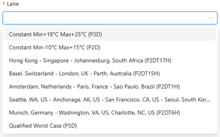 Lane: Select your planned transport route. The coding in brackets corresponds to the ISO 8601 format for the duration.