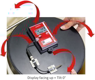 When the device lies flat with the display facing up, this corresponds to a tilt of 0°. If the device is in the opposite position, with the display facing down, the sensor shows a tilt of 180°, regardless of the direction the LIBERO Gx is tilted. The angle is always measured relative to the 0° position.